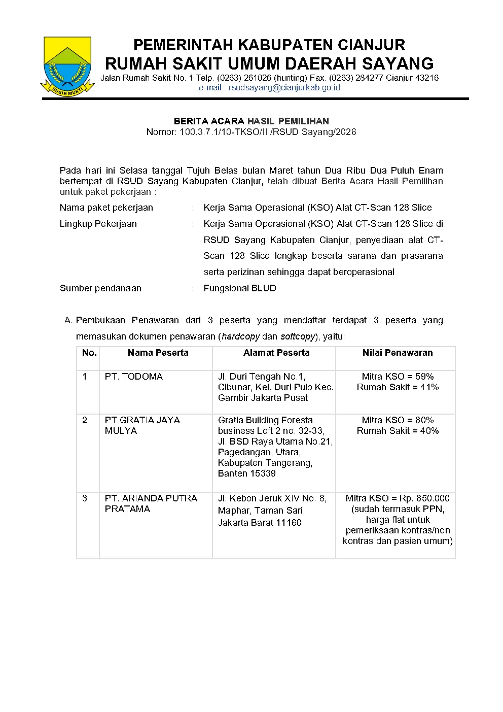 Berita Acara Penetapan Pemenang Pemilihan Mitra KSO CT-Scan 128 Slice https://drive.google.com/file/d/1nMAGErZMiLZ3LsscfB9Prz_MDLKRYDt2/view?usp=sharing]